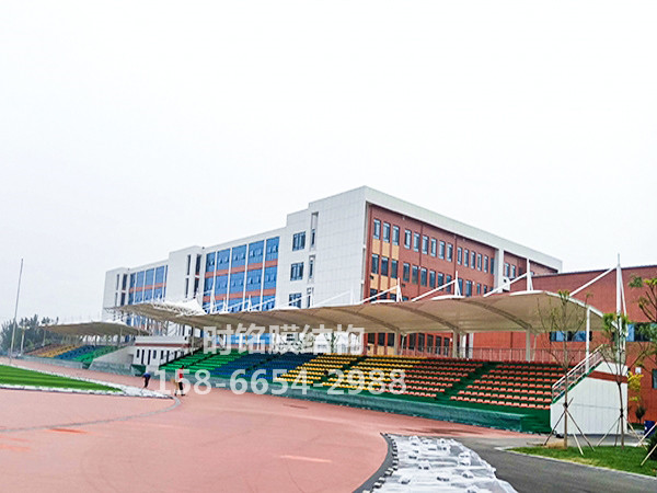 膜结构主要用于体育设施,在学校操场的体育看台或领奖台的屋顶。膜结构屋顶在大型体育场馆中也并不少见。一般的立柱形态由贝壳状的峰膜和端部张力膜组成,新颖活泼。钢架、索、膜巧妙组合,由膜、膜边索、脊索、谷索、索、杆及一定格梁稳定。膜的顶部过渡流畅,结构美观、轻巧,整体造型相互辉映,独树一帜。
