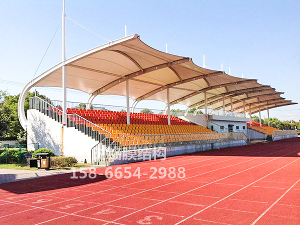 膜结构主要用于体育设施,在学校操场的体育看台或领奖台的屋顶。膜结构屋顶在大型体育场馆中也并不少见。一般的立柱形态由贝壳状的峰膜和端部张力膜组成,新颖活泼。钢架、索、膜巧妙组合,由膜、膜边索、脊索、谷索、索、杆及一定格梁稳定。膜的顶部过渡流畅,结构美观、轻巧,整体造型相互辉映,独树一帜。