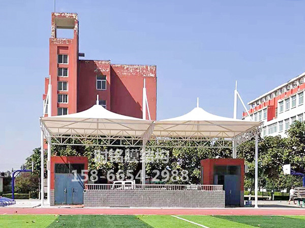 膜结构主要用于体育设施,在学校操场的体育看台或领奖台的屋顶。膜结构屋顶在大型体育场馆中也并不少见。一般的立柱形态由贝壳状的峰膜和端部张力膜组成,新颖活泼。钢架、索、膜巧妙组合,由膜、膜边索、脊索、谷索、索、杆及一定格梁稳定。膜的顶部过渡流畅,结构美观、轻巧,整体造型相互辉映,独树一帜。