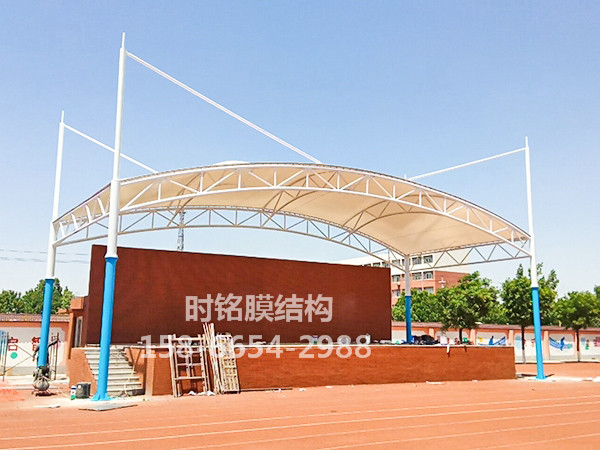 膜结构主要用于体育设施,在学校操场的体育看台或领奖台的屋顶。膜结构屋顶在大型体育场馆中也并不少见。一般的立柱形态由贝壳状的峰膜和端部张力膜组成,新颖活泼。钢架、索、膜巧妙组合,由膜、膜边索、脊索、谷索、索、杆及一定格梁稳定。膜的顶部过渡流畅,结构美观、轻巧,整体造型相互辉映,独树一帜。