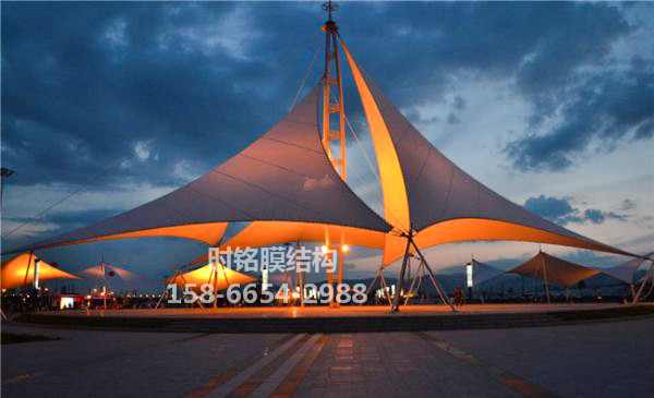 膜结构景观棚的稳定性取决于膜表面预张力的保持。预紧力的大小影响膜在荷载作用下的变形程度。如果预紧力过小,膜在风荷载作用下会发生较大的变形,颤振发生。如果荷载持续时间较长,膜会松弛和蠕变,因此膜表面的预应力在使用过程中会发生变化。膜结构景观棚的膜材性能可以通过双轴试验来确定。如果预紧力过低,则需要保持预紧力以恢复其预紧力。