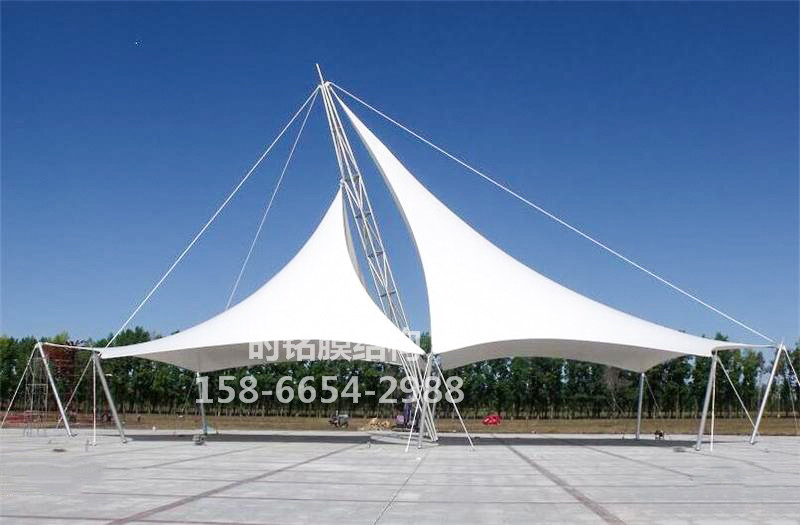 膜结构景观棚的稳定性取决于膜表面预张力的保持。预紧力的大小影响膜在荷载作用下的变形程度。如果预紧力过小,膜在风荷载作用下会发生较大的变形,颤振发生。如果荷载持续时间较长,膜会松弛和蠕变,因此膜表面的预应力在使用过程中会发生变化。膜结构景观棚的膜材性能可以通过双轴试验来确定。如果预紧力过低,则需要保持预紧力以恢复其预紧力。